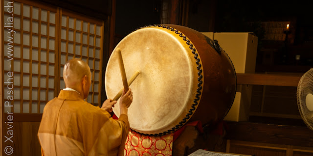 Seules certaines cérémonies permettent de révéler la statue cachée de Zaō Daigongen dans le temple. Après notre purification sous la chute d’eau, une cérémonie nous est spécialement dédiée afin de rencontrer cette divinité principale, alliée à la trinité d’Amida Sanzon. Le moine commence par jouer du Taiko puis entrer dans une forme de méditation et de transe en psalmodiant et en frappant le gigantesque tambour avec force. Les vibrations sont puissantes. Puis la divinité apparaît, terrible et farouche. Elle a une position dynamique entre des flammes. Divinité de la compassion pour les êtres vivants, elle est cette fois représentée dans son côté impitoyable pour illustrer sa puissance, qui incite et encourage les pratiquants à la persévérance. Nous sommes honorés d’être accueillis pour cette cérémonie et surtout touchés par l’intensité qui s’en dégage. Quotidiennement en nature, nous comprenons la puissance des esprits présents dans les lieux sacrés et les montagnes, leur incroyable guidance et à la fois leur force de destruction potentielle. À chaque fois, nous nous sentons les invités à respecter ce délicat équilibre.